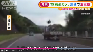 飛んできた亀が高速走行中の車にぶつかる事故の様子